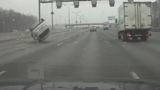 Потерявший управление водитель легковушки врезался в отбойник и перевернулся на юго-западе Москвы. Телеканал «360» публикует запись с двух камер регистраторов. Серьезное ДТП произошло около 11:00 на 44-м километре внутренней стороны МКАД, недалеко от Ленинградского проспекта. На кадрах видно, как белая иномарка плавно перестраивается в ближайший к отбойнику ряд, но водитель не только не подает никаких сигналов, но и, судя по всему, не управляет машиной. Автомобиль проходит между другими участниками движения и врезается в бетонный отбойник, после чего отлетает на проезжую часть. Предположительно, после столкновения водитель проснулся и попытался взять ситуацию под контроль, но в итоге машина еще раз налетела на отбойник и перевернулась, не задев другие транспортные средства. По меньшей мере одному из автолюбителей удалось проскочить мимо без повреждений. О состоянии виновника ДТП ничего не сообщается.