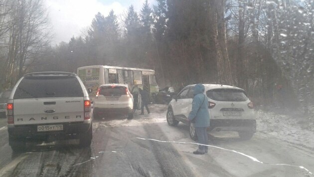 Маршрутка пострадала от столкновения с иномаркой. В Петербурге произошла серьезная авария с участием маршрутки. Вечером 26 апреля на Приозерском шоссе в лоб столкнулись 433 маршрутка и автомобиль Volvo. Об этом сообщают очевидцы из группы "ДТП и ЧП. Санкт-Петербург". В результате травмы получили шесть человек, в том числе и водитель иномарки За рулем Volvo была женщина, кроме того, автомобиль был на летней резине. "Тяжелых нет. Сломаны носы и рассечения. В автобусе ехал сам", - пишет в комментариях один из пользователей. Есть предположения, что ДТП с участием маршрутки поспособствовали плохие погодные условия: как раз в это время шел сильный град, видимость была ухудшена.