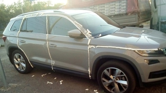На снимке, опубликованном порталом, автомобиль стоимость около полутора миллионов рублей покрыт аккуратными полосами монтажной пены — между кузовом и дверьми и кузовом и капотом.