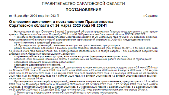 В Саратовской области продлен режим самоизоляции для граждан старше 65 лет до 4 января. Об этом гласит постановление правительства региона за подписью его председателя Романа Бусаргина. Руководителей организации обязали предусмотреть сохранение удаленного режима работы или введение посменного графика, если это не нарушает режим функционирования. Необходимо соблюдать дезинфекционный и масочный режимы.