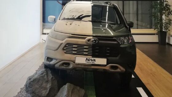 В салонах рекламные машины LADA Niva Travel покрыли имитацией грязи, которую якобы преодолевает внедорожник. На новинке продемонстрирован давний дефект - некачественные дворники.