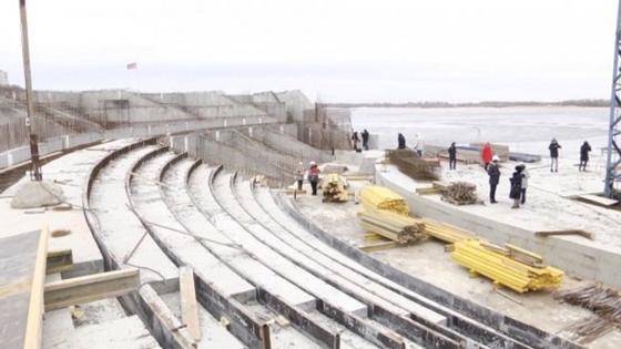 Амфитеатр станет одним из главных украшений обновленной набережной. Площадка на 2300 посадочных ест позволит наслаждаться концертами и представлениями с видом на Волгу. В настоящее время все отставание сроков ликвидировано, идет установка железобетонных конструкций в верхней части трибунных помещений, после чего начнутся отделочные работы.