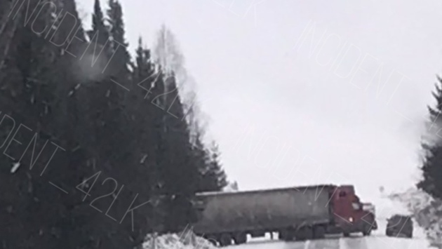 На кузбасской автодороге грузовик заскользил на гололеде и в результате перекрыл проезд.