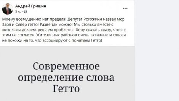 «Моему возмущению нет предела! Депутат Рогожкин назвал микрорайоны Заря и Север гетто! Разве так можно! Мы столько вместе с жителями делаем, решаем проблемы! Хочу сказать сразу, что я с этим не согласен. Жители этих районов очень активные и совсем не похожи на то, что ассоциируют с понятием «гетто»!» - написал Андрей Гришин на своей странице в Facebook.
