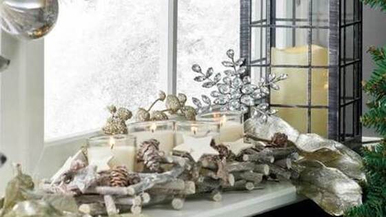 Уютный декор с помощью свечей. Это отличное решение для украшения окон на Новый год. Лучше всего делать композицию из красных, золотистых, белых, голубых или серебристых изделий. Свечи должны быть разной высоты и ширины. Возьмите серебристый поднос и поставьте изделия на него, а сверху украсьте гирляндой и еловыми ветвями. Такая композиция будет радовать глаз и наполнять комнату мягким, природным светом.