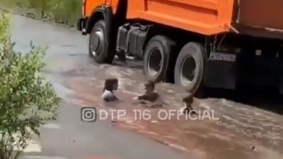 На кадрах видно, что на дороге в глубокой луже купаются трое детей, а рядом проезжает грузовик, неподалеку по дороге едут другие автомобили.