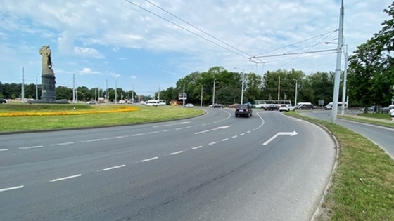 Выезжать с круга на Невского можно только с крайней полосы, а не с двух, как раньше. Чтобы повернуть в направлении БСМП, нужно занять крайнее правое положение. Это позволит не ставить дополнительные знаки на развязке.