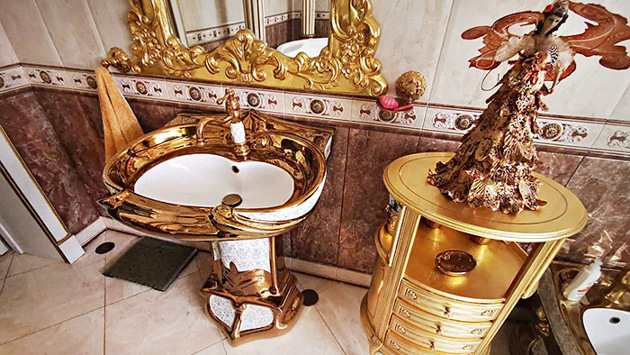 Большой особняк, во дворе иномарки, одна из них — белоснежный внедорожник BMW. Внутри — комнаты, отделанные позолотой, пачки пятитысячных купюр. А больше всего внимания, конечно, привлекла просторная уборная с позолоченной сантехникой.