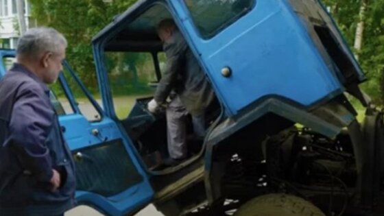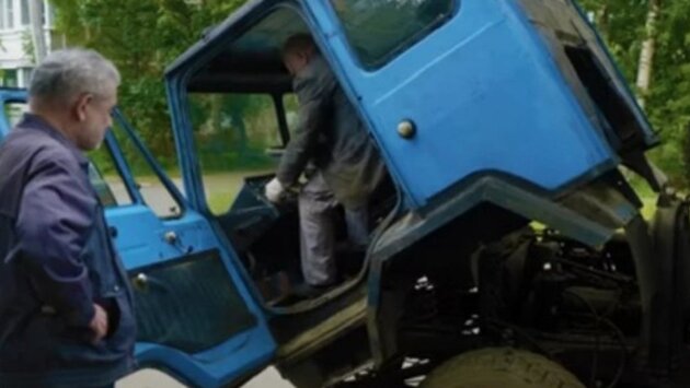 Далее требуется толкнуть кабину вверх, взявшись за нижний правый угол кабины авто. Во время ручного подъема кабины Колхиды следует изловчиться, а также ногой зафиксировать упор, не дающий кабине упасть. После таких действий можно заняться двигателем.