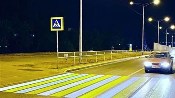 Оборудование, размещенное над переходом, создает яркий световой коридор с помощью светодиодных проекторов с цветными фильтрами, которые проецируют на дорогу изображение бело-желтой разметки. Пешеходы окрашиваются желто-белыми полосами и становятся заметнее. Такая разметка не сотрется со временем и хорошо заметна в темное время суток при любой погоде.