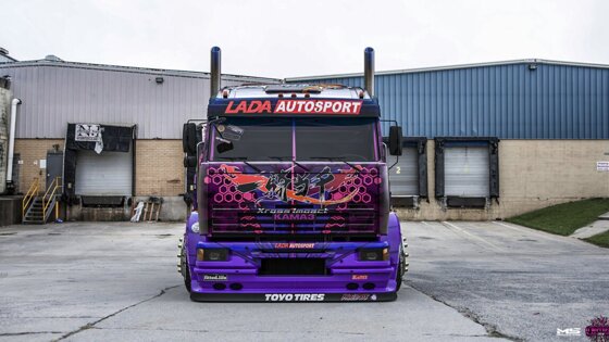 Независимому дизайнеру Михаилу Сачко показалось недостаточным современное оформление КАМАЗов и он предложил весьма интересное решение, поместив при этом на платформу грузовика дрифтовый ВАЗ-2108.