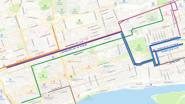 В донской столице во время проведения пятого Ростовского велопарада #ЗАВЕЛОРОСТОВ работа общественного пассажирского транспорта города будет изменена в соответствии с введенными ограничениями дорожного движения. Об этом сообщает пресс-служба администрации города. С 8:00 до 12:30: Муниципальные автобусные маршруты №№ 3, 3а, 7, 67, 70, 80, 88 в прямом направлении будут осуществлять движение по схеме: пл. Привокзальная – ул. Красноармейская – пр. Театральный – ул. Закруткина – ул. Нижненольная – ул. Мясникова – ул. 1-я Линия – ул. Советская. В обратном направлении: ул. Советская (ул. 1-я Майская – ул. Верхненольная для маршрутов №№ 3, 3А) – ул. Нижненольная – ул. Закруткина – пр. Театральный – ул. Красноармейская – пл. Привокзальная. Движение автобусов по муниципальным маршрутам №№ 24, 81, 98 будет осуществляться по схеме в прямом направлении: пр. Театральный – ул. Закруткина – ул. Нижненольная – ул. Мясникова – ул. 1-я Линия – ул. Советская. В обратном направлении: пл. Свободы – пл. К. Маркса – ул. 1-я Майская – ул. Верхненольная – ул. Нижненольная – ул. Закруткина – пр. Театральный и далее по маршрутам. Движение транспортных средств по автобусному маршруту № 55 будет осуществляться по схеме: пр. Театральный – ул. Закруткина – ул. Нижненольная – ул. Мясникова и далее по маршруту следования. Автобусы, используемые для осуществления регулярных пассажирских перевозок по муниципальному маршруту № 33, будут осуществлять движение в прямом направлении по схеме: пр. Ворошиловский – ул. Красноармейская – пл. Привокзальная. В обратном направлении: пл. Привокзальная – ул. Красноармейская – пр. Ворошиловский и далее по маршруту следования. Движение транспортных средств по муниципальному маршруту № 39 в прямом направлении осуществлять по схеме: ул. Московская – пр. Ворошиловский – Ворошиловский мост и далее по маршруту следования. Троллейбусы, обслуживающие муниципальный маршрут № 1, будут работать по схеме: пл. Привокзальная – ул. Красноармейская – пр. Театральный – пр. Шолохова и далее по маршруту следования в обоих направлениях. Работа троллейбусов по муниципальным маршрутам № 2 и 22 в прямом направлении будет организована по схеме: пл. Привокзальная – ул. Красноармейская – пр. Театральный – пр. Шолохова – ул. 20-я Линия – пл. К. Маркса. В обратном направлении: пл. К. Маркса – ул. 20-я Линия – ул. Лекальная – ул. 22-я Линия – пр. Шолохова – пр. Театральный – ул. Красноармейская – пл. Привокзальная и далее по маршрутам. Движение трамваев по муниципальному маршруту № 4 будет осуществляться по схеме: ул. Станиславского – пр. Буденновский – ул. М. Горького – ул. Ченцова и далее по маршруту следования в обоих направлениях. С 8:00 до 12:30 будет отключены контактные сети электротранспорта на ул. Советская, пл. Театральная и ул. Большая Садовая.