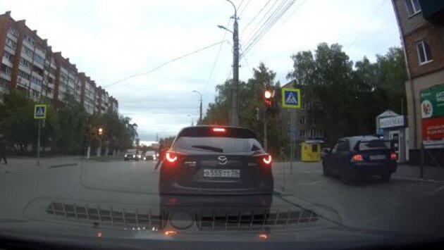 Владелец регистратора, как и водитель впереди него, остановился на запрещающий сигнал светофора у пешеходного перехода.