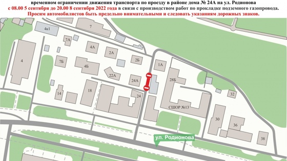 В Нижнем Новгороде с 6.00 5 сентября до 23.59 30 сентября будет временно приостановлено движение транспорта на участке улицы Трудовой между домом №93А и домом №77Б по улице Ковалихинской в связи с ремонтно-восстановительными работами на инженерных сетях. Об этом сообщили в департаменте транспорта и дорожного хозяйства администрации Нижнего Новгорода. «На подъездах к участку будут установлены предупреждающие аншлаги и запрещающие движение дорожные знаки. Объехать закрытый участок дороги можно по улицам Ковалихинской, Провиантской и Максима Горького», – отметили в департаменте.Специалисты рекомендуют автомобилистам заранее ознакомиться со схемой движения, быть предельно внимательными и следовать указаниям дорожных знаков. Напомним, редакция сайта pravda-nn.ru создала телеграм-канал «Дорожные работы», где оперативно сообщается об участках перекрытых дорог в Нижнем Новгороде. Подписывайтесь, чтобы быть в курсе!