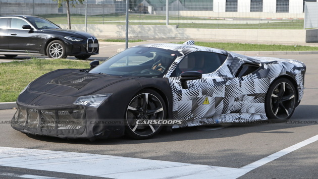 Ferrari в очередной раз тестирует высокопроизводительную версию своего лучшего дорожного автомобиля SF90. Модель с тяжелым камуфляжем спереди и более легким камуфляжем сзади и по бокам может быть прототипом грядущей «Versione Speciale». Тяжелая черная ткань спереди предполагает, что в этой части автомобиля будут обновления. Выступающая передняя губа предполагает, что скачущий конь работает над тем, чтобы добавить больше прижимной силы в передней части гибридного суперкара со средним расположением двигателя. По бокам появились новые боковые юбки, которые помогают направлять воздух вокруг автомобиля. Это тоже может быть обманом света, но задняя часть автомобиля кажется длиннее, чем на стандартном SF90. Возможно, Ferrari работает над собственным суперкаром с длинным хвостом, чтобы присоединиться к Pagani Codalunga. Это не первый раз, когда фотошпионы ловят SF90 на тестировании. В сентябре итальянский автопроизводитель был в Германии, тестируя на Нюрбургринге крупнокрылую версию автомобиля. Хотя его планы относительно моделей остаются неизвестными, в задней части этой версии нет большого заднего крыла, а также нет модификаций ниже выхлопных труб, как у этой модели. Тогда это может означать, что версия с большими крыльями — это SF90 XX, предназначенная только для трека для лучших клиентов Ferrari, в то время как это может быть Versione Speciale, ориентированный на исполнение, который остается разрешенным для использования на дорогах. Ferrari обычно хранит молчание о всех своих планах относительно платформы SF90, поэтому то, что происходит под капотом, остается загадкой. Ожидается, что гибридная трансмиссия претерпит изменения, которые подтолкнут ее к текущему максимуму в 986 л.с. Читайте также о том, что спорткар Ferrari F355 сгорел дотла во время тест-драйва потенциального покупателя.
