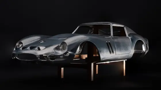 Дело в том, что кузов длиной 1,08 метра и весом около пяти килограммов выколочен вручную. Точно так же оригинальные кузова 250 GTO делали в Carozzerie Scaglietti 60 лет назад. Используемая Amalgam мастер-модель создана на основе цифровых сканов нескольких 250 GTO, реплики которых фирма изготовила за прошедшее годы. Кузов можно поставить на козлы, в данном случае сделанные из орешника, либо повесить на стену.