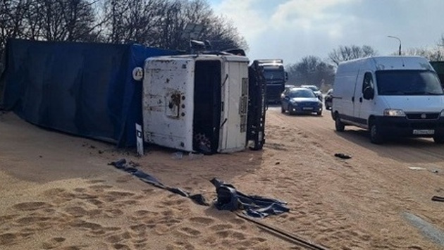 На въезде в Новороссийск водитель зерновоза не справился с управлением, машина перевернулась