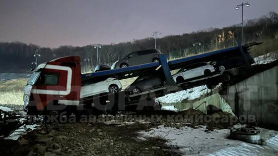 В районе улицы Адмирала Смирнова во Владивостоке автовоз с машинами покатился, ударил припаркованный Nissan X-trail и скатился с косогора на территорию стройки. В кузове автовоза находились Toyota Allion, Honda Vezel, Nissan Leaf, Toyota Fielder, Toyota Ractis, Toyota Alphard, Toyota Isis и еще несколько других автомобилей, сообщает PRIMPRESS со ссылкой на Telegram-канал gorod_vl.