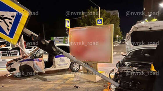 На фото с последствиями аварии, опубликованном Telegram-каналом «Новороссийск ДТП», видно, что белый Hyundai наехал на опору дорожного знака «пешеходный переход». Полицейская Lada в спецраскраске врезалась в другой столб.