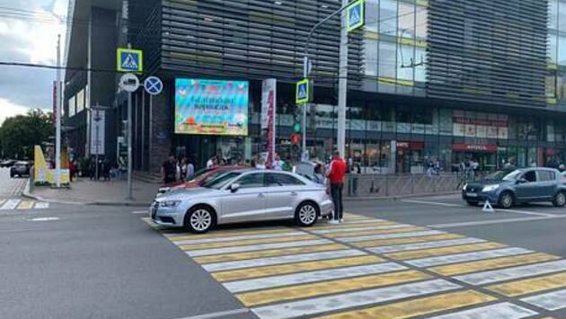 ЧП произошло около 17:00 у торгового центра «Эпицентр». Подробности не приводятся. Судя по фото, которое прислал читатель, машина перекрыла большую часть «зебры», оставив пешеходам только небольшой участок.