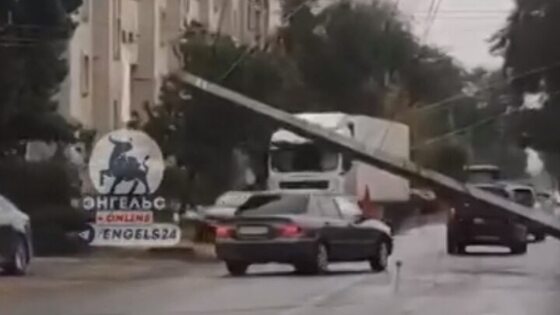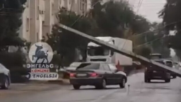 «Приуныл»: в Энгельсе столб завис над дорогой на электрических проводах