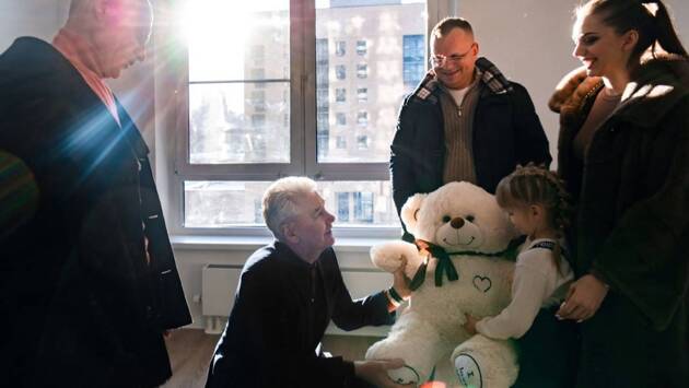 Сергей Собянин поздравил семью с новосельем, вручив им сертификаты на машино-место и на покупку кухни. А пятилетняя дочка Владимира и Ксении получила в подарок большого плюшевого медведя.