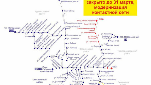 «Следующий этап модернизации контактной сети начнется 17 февраля, и предварительно продлится до 5 утра 13 марта на двух участках: Новороссийская от Гагарина до Машиностроителей, Машиностроителей от Копейского шоссе до Новороссийской», — говорится в сообщении telegram-канала «Челябинский общественный транспорт»