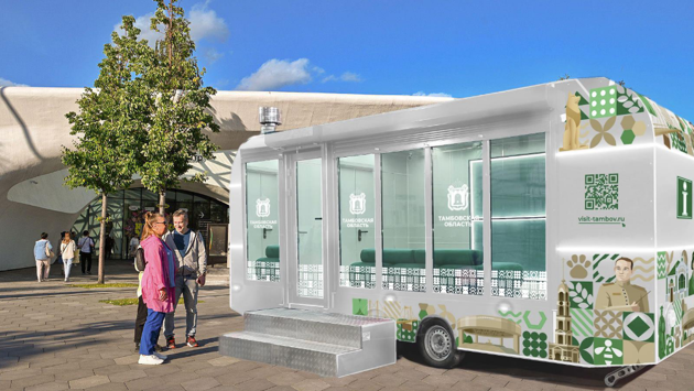 Мобильный турофис забрендирован. Снаружи изображены портреты наших известных земляков - Василия Агапкина, Василия Поленова, Ивана Мичурина, а также узнаваемые памятники и символы нашего региона — это традиционный тамбовский узор, пчелиная сота, неваляшка, яблоки и вишня, сахар и рожь. Для брендирования специально выбрали цвета — зеленый и охру, что символизирует экологическую чистоту и безопасность Тамбовской области.