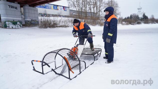«По плану проведения противопаводковых мероприятий спасатели аварийно-спасательной службы приступили к ледорезным работам согласно графику. Начали с моста 800-летия. Далее приступим к другим опасным местам, где возможны заторы. Это опоры мостов, два на реке Тошне и четыре на реке Вологде. Лёд у моста 800-летия толщиной порядка 40 сантиметров, по всей акватории он неравномерен», — говорит главный специалист аварийно-спасательной службы Центра гражданской защиты Вологды Сергей Едемский.