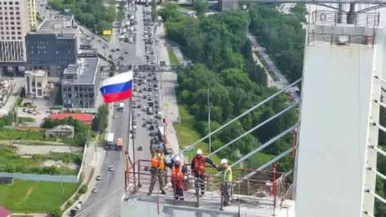 Ко Дню России на пилоне строящегося моста в Новосибирске традиционно водрузили государственный флаг страны
