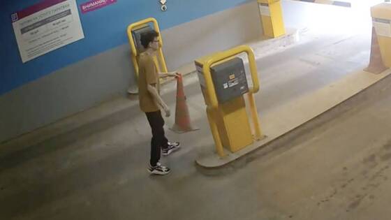На кадрах, снятых камерой наблюдения на выезде с подземной парковки, мужчина останавливает свой автомобиль на выезде из торгового центра. Затем он берет два стоящих за шлагбаумами конуса, кладет их на заднее сиденье и уезжает.