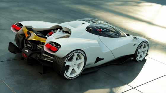 В разных местах кузова его дизайн напоминает LaFerrari, DeTomaso P72 и Ferrari 330 P4. Самый интересный ракурс — сзади, где мы видим открытый двигатель с коллектором, соединяющим 12 выхлопных патрубков в 3 выхлопные трубы.