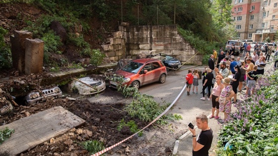 Во Владивостоке подпорное укрепление обрушилось на припаркованные автомобили