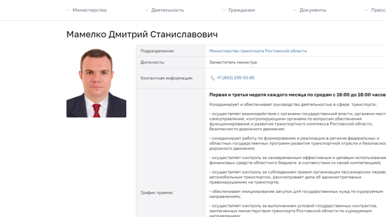 Ростовская область, 7 октября 2024. DON24.RU. В министерстве транспорта Ростовской области назначили нового заместителя министра – Дмитрия Мамелко. Об этом свидетельствует информация, опубликованная на сайте Правительства Ростовской области. Среди должностных обязанностей нового министра – координация работы по формированию и реализации в регионе федеральных и областных государственных программ развития транспортной отрасли и безопасности дорожного движения, а также координация и контроль деятельности управления транспорта, сектора безопасности дорожного движения. Помимо этого, Дмитрий Мамелко будет рассматривать обращения граждан, обеспечивать инициирование закупок для госнужд по курируемым направлениям и мн. др. Ранее новым главой Таганрога избрали Светлану Камбулову, а председателем Таганрогской городской думы – Романа Корякина.