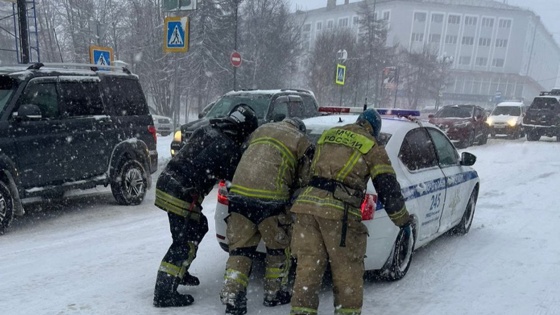 Пожарные и спасатели оказывают помощь автомобилистам, выталкивают и буксируют технику из снежных заносов, на дорогах дежурят оперативные группы.
