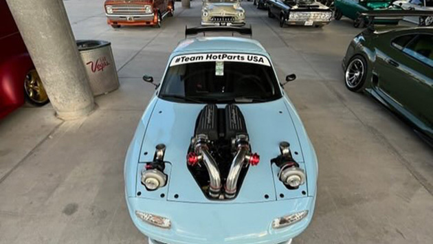 Необычная Mazda Miata, окрашенная в небесно-голубой оттенок, стала одним из главных экспонатов выставки SEMA в этом году. В результате установки двигателя V10 с двумя турбинами, а также других технических узлов, большинство из которых находится над передними колесами, спорткар, безусловно, потерял в управляемости. Однако вместо заводских 116 лошадиных сил автомобиль существенно прибавил в мощности.
