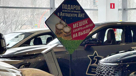 Судя по фото рекламного щита, сделанному в дилерском центре, покупателю предлагается выбрать подарок самому — мешок муки или сахарного песка.
