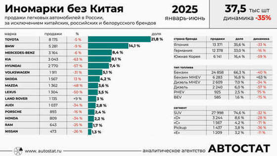В России при отсутствии иномарок из Китая лидером авторынка среди зарубежных брендов стала бы Toyota. Об этом рассказал директор агентства "Автостат" Сергей Целиков. "Для того, чтобы понять, как бы мы жили без Китая, сделал выборку "альтернативных" брендов. Для анализа взяты данные по постановке на учет за первую половину 2025 года. Таких автомобилей оказалось всего 37,5 тысячи штук. А это всего 7% авторынка", - пояснил эксперт. В итоге лидером рынка стала бы Toyota с долей 21,8% этого сегмента -- это каждый пятый автомобиль. Также в топе были были BMW, Mercedes-Benz, Hyundai и Kia. "Выбирая альтернативу Китаю, на первое место покупатели ставят немецкие автомобили (35,6%), потом японские (33%), и на "худой конец" корейские (16,4%). На эти три страны приходится порядка 85% альтернативного сегмента", - подытожил Целиков. До этого сообщалось, что среди подержанных кроссоверов и внедорожников в бюджете 1 млн рублей достойными для покупки вариантами являются Renault Duster и Lada Niva Travel. В том же бюджете можно приобрести SsangYong Actyon 2014-2015 годов выпуска, с бензиновым мотором или дизелем мощностью 150 л.с. Еще один вариант за 1 млн рублей — Toyota RAV4 2008-2009 годов выпуска с атмосферным 2,0-литровым мотором мощностью 152 л.с.