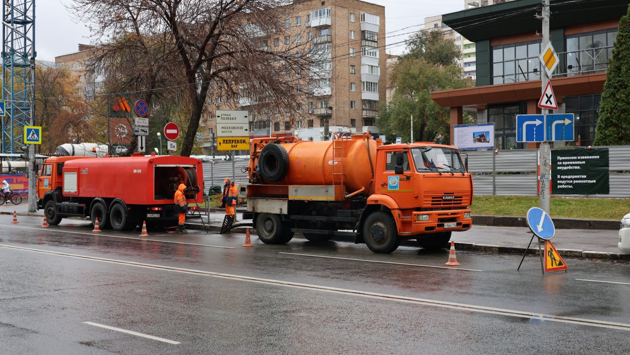 Всего для гидродинамической очистки водосточных сетей задействованы около 30 сотрудников, работающих в составе 6–8 бригад. На каждом участке применяются каналоочистительные машины с давлением до 160 атмосфер, а также специализированные машины для откачки воды.