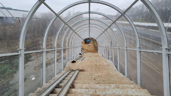 Первый переход почти готов — более 95%. Уже остеклили его и начали монтировать освещение. На втором переходе продолжают остекление и установку светильников. Третий переход почти готов: возвели металлокаркас для остекления. Общая готовность объектов — 90% и более 75%.