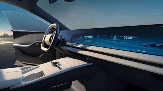 Geely E8 привлекает своим оригинальным дизайном интерьера: передняя панель оборудована большой медиапанелью с диагональю 45 дюймов, состоящей из трех бесшовных экранов.