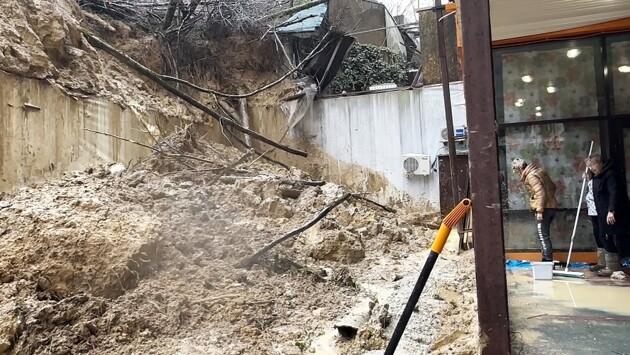 Сегодня огромная масса земли вперемешку с грунтовыми водами неуправляемо надвигается с горы на жилой дом. А тут еще ливни. На первом этаже в окнах уже выбило стекла. Жители в авральном режиме собирают воду ведрами, тряпками, лопатами отгребая кучи грязи.