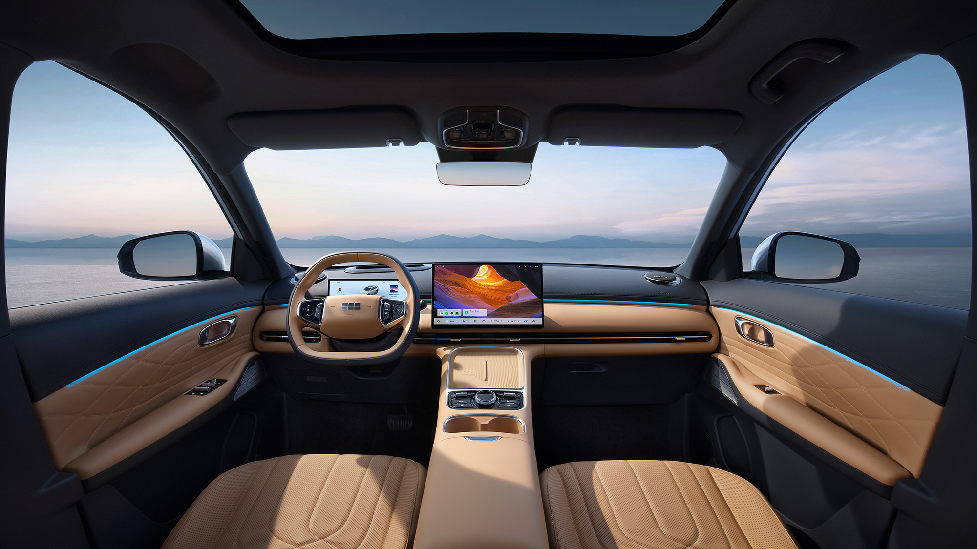 В оснащение салона полуэлектрического паркетника включены: 10,2-дюймовая цифровая приборная панель, мультимедийная система диагональю 15,4 дюйма, аудиосистема с 16 динамиками и сабвуфером, спрофилированные многослойные кресла, атмосферная подсветка.