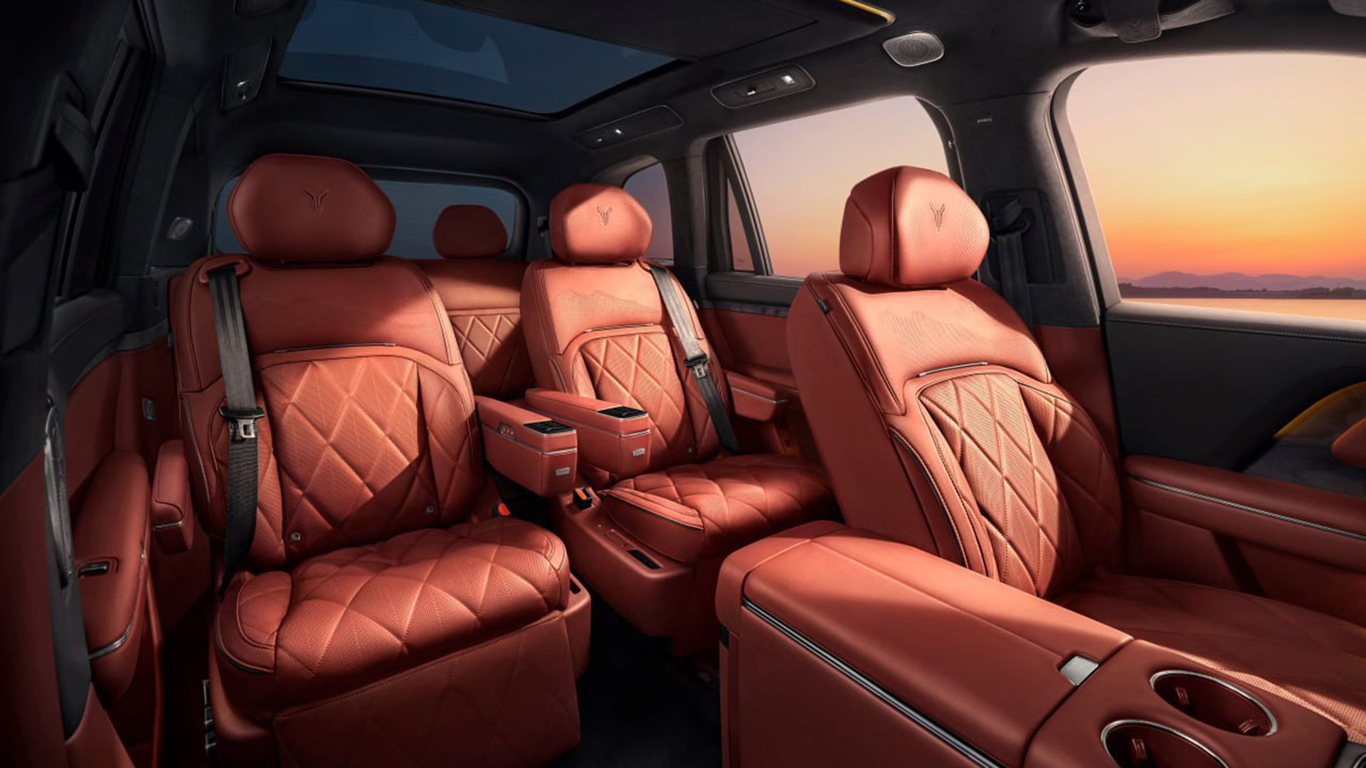 В оснащение салона входят проекционный дисплей с дополненной реальностью, встроенные в подголовники динамики, беспроводная зарядка для мобильных устройств, двухсекционная панорамная крыша, потолочный экран, а также встроенный холодильник и складные столики.
