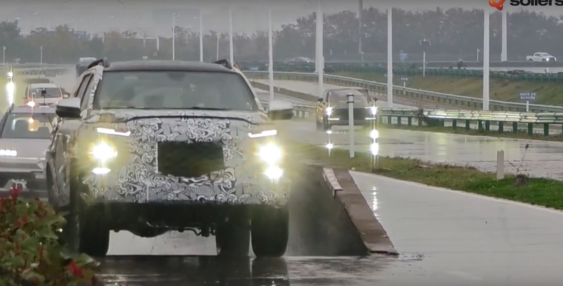 Судя по всему, тесты проходят в Китае. На улицу прототип, как и положено, выехал в защитном окрасе, даже сквозь который можно разглядеть дизайн кузова. Трехэтажная оптика впереди с узкими дневными ходовыми огнями, прямоугольные фонари, массивные рейлинги на крыше, большой задний свес — всё это указывает на то, что под камуфляжем скрывается JAC JS9.