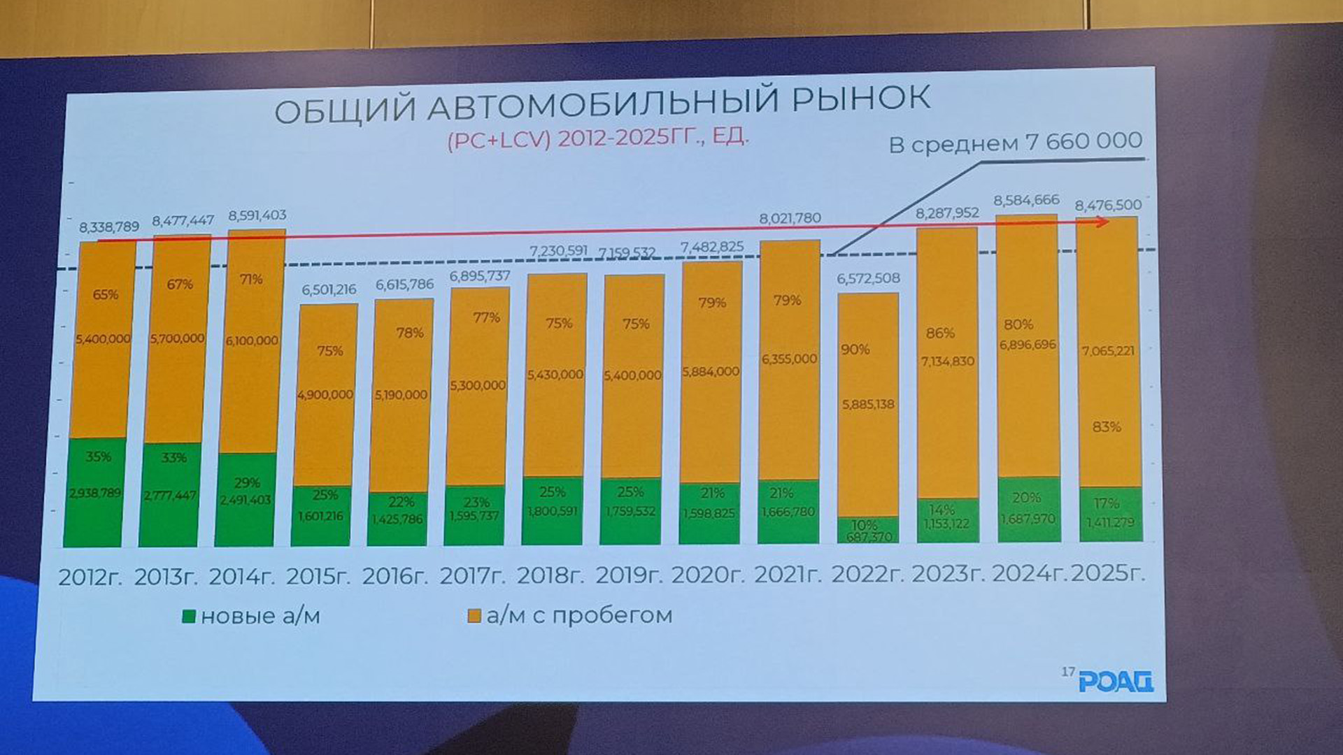 Как передаёт корреспондент «Рамблер/авто» с пресс-конференции РОАД (Ассоциация «Российские автомобильные дилеры»), в прошлом году доля новых машин в российских продажах составила 17% – 1,41 млн единиц. Остальные 83% или 7 млн – это авто с пробегом.