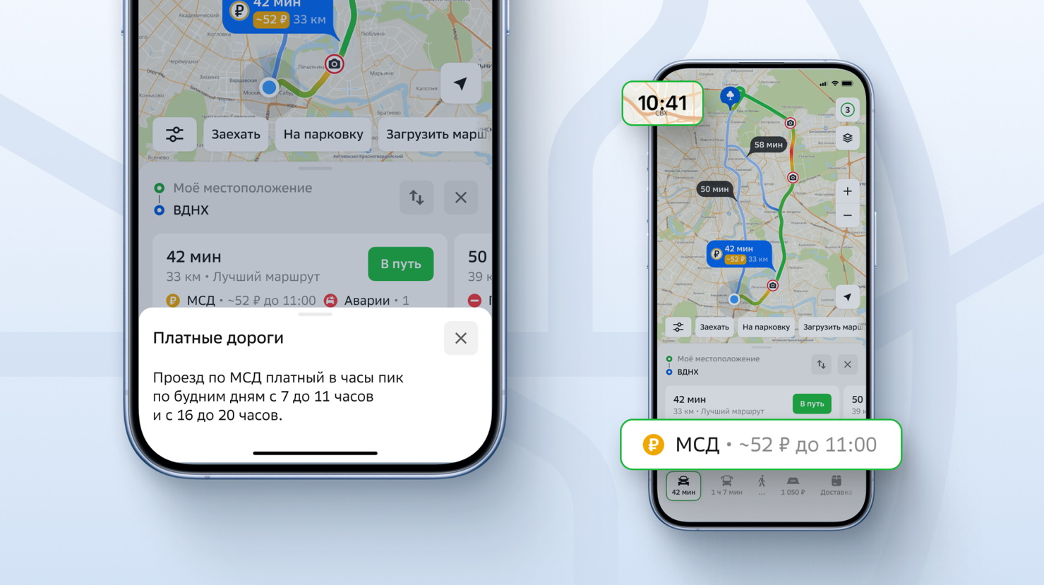 Московский скоростной диаметр (МСД) — одна из главных скоростных магистралей столицы. Она работает с гибкой тарификацией — плата взимается только в часы пик. Теперь 2ГИС показывает, когда МСД платный, а когда нет, и стал первым картографическим сервисом в России, который учитывает переменный режим платной трассы при построении маршрутов. Пользователи видят не только сам факт платности, но и сколько будет стоить маршрут, а ещё предупредит о приближающемся начале платного периода или о его окончании.