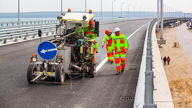 "Мы наносим горизонтальную дорожную разметку, выполненную из термопластика с высокими светоотражающими характеристиками, с высоким показателем белизны. Разметка служит ориентиром для водителей, определяя границы их движения по автодороге через Керченский пролив", – сообщил начальник участка по нанесению дорожной разметки Павел Матящук, передает в пятницу инфоцентр Крымского моста. Перед нанесения разметки материалы прошли двухэтапный отбор. Сперва строители оценили несколько вариантов термопластиков на подложке, провели тестовые испытания на асфальтобетоне, проверили светоотражающие способности и выбрали наиболее качественные варианты. Габариты разметки следующие: ширина краевой линии – 20 см, а осевой линии дорожной разметки – 15 см. Толщина линии разметки – около 4 мм. Движение по Крымскому мосту будет открыто в мае. Ознакомиться с основными фактами об этом сооружении вы можете в материале "Авторамблера". Фото: most.life