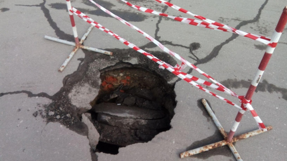 Глубокий провал в асфальте возле Саратовской областной думы огородили специальной конструкцией с сигнальной лентой. В этом сегодня убедился корреспондент местного портала «Четвёртая Власть». Глубокий провал на проезжей части возле здания областной думы, который заметил сегодня депутат Алексей Наумов, оказался когда-то закатанным в асфальт техническим колодцем. По непонятным пока причинам часть дороги вокруг колодца ушла под землю, оставив чиновникам и депутатам только одну полосу для въезда и выезда с парковки.