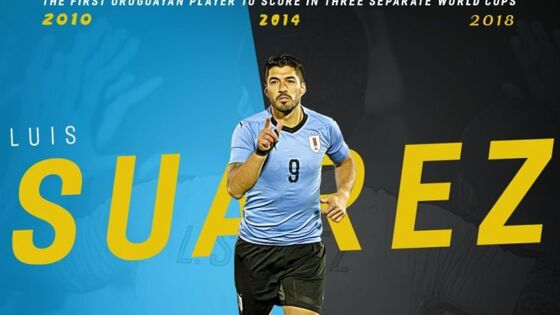 Нападающий сборной Уругвая Луис Суарес забил гол в матче второго тура группового этапа Чемпионата Мира-2018 против Саудовской Аравии (1:0, первый тайм). Стоит отметить, что Суарес стал первым уругвайским игроком в истории, которых сумел отличиться на трех мундиалях. Ранее 31-летний Суарес забивал на ЧМ-2010 (3 мяча) и ЧМ-2014 (2 гола).